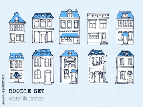 Hand drawn European city houses set in cute cartoon style. Colorful modern townhouse building sketch. Old houses, City buildings, decorative elements collection. Creative vector illustration.