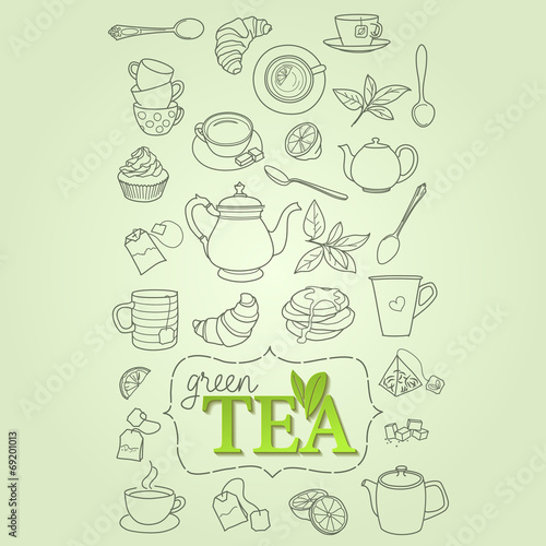 Hand drawn green tea doodle concept vector