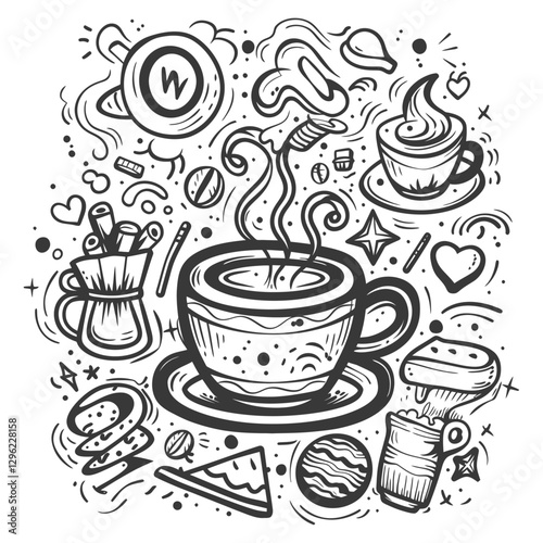 Hand Drawn Illustration Of A Cup Of Coffee With Whipped Cream And Surrounding Doodle Elements