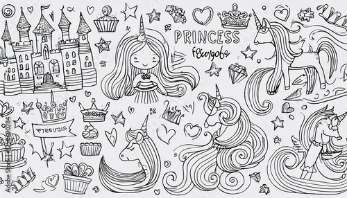 Hand drawn princess doodle set. Beauty cute girl princess accessories, fairy unicorn, castle. Doodle background. perfect any project.