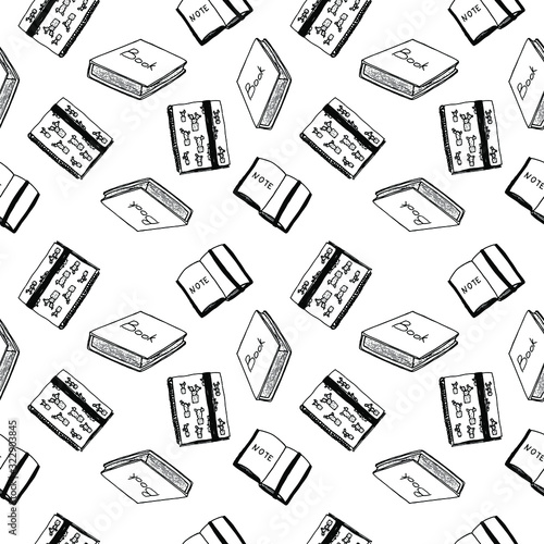 Hand drawn, seamless pattern school stationery items. Black on white background. Vector art. Plants succulents, pens, pencils, brushes, stapler. Doodle style