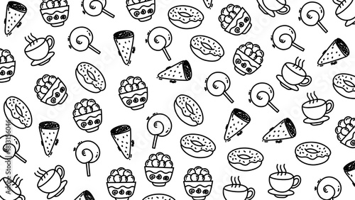 Hand drawn sweet food doodle pattern with donuts lollipops coffee and dessert bowls