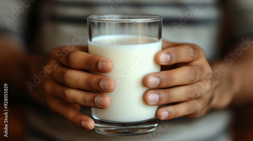 hand gently holding a glass of milk, symbolizing purity, nourishment, and simplicity. The clean, white background emphasizes the wholesome and natural essence of the milk