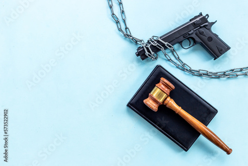Hand gun weapon in chains. Ban on carrying weapons gun law concept
