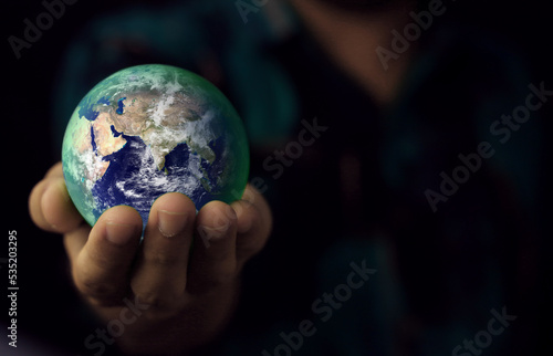 Hand hold globe with dark background.Elements of this image furnished by NASA