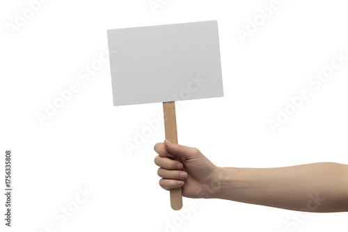 Hand holding a blank white sign on a wooden stick, isolated on white background