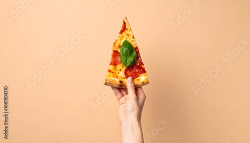 Hand holding a fresh slice of classic pepperoni pizza with a green basil leaf against a solid neutral background, concept of enjoying a snack.
