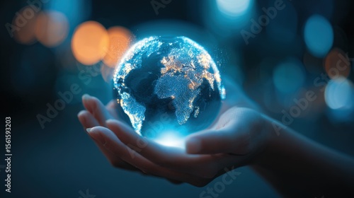 Hand Holding A Glowing Earth Globe With Bright City Lights And Bokeh Effect.