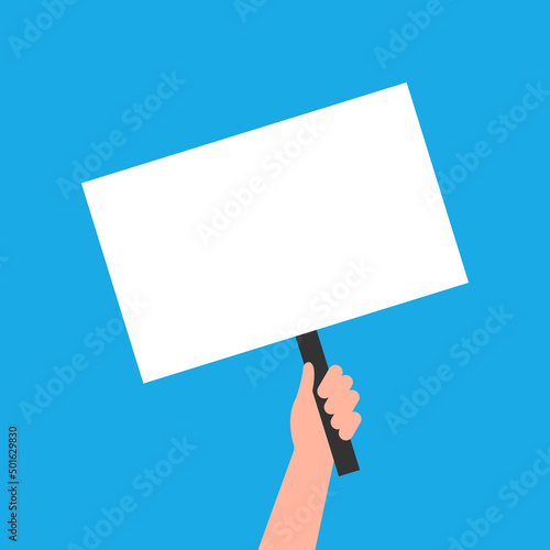 Hand holding a sign. Empty sign blank on blue background. Vector EPS10