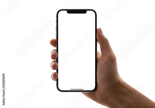 Hand holding a smartphone with a blank white screen for mockup. Isolated on transparent background, png