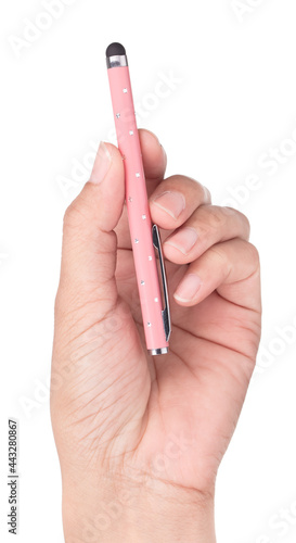 hand holding a soft pointed touchscreen stylus pen isolated on white background