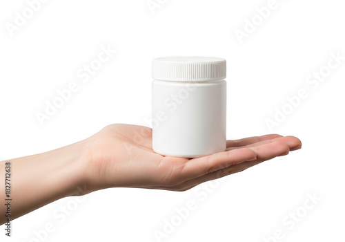 Hand holding a white pill bottle isolated on transparent background