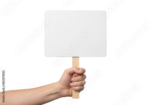 Hand holding blank sign protest mockup demonstration banner advertisement template isolated on transparent background