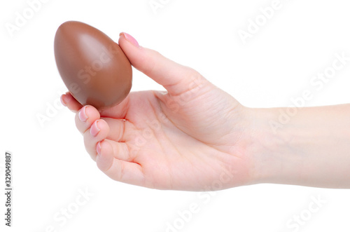 Hand holding chocolate egg sweet candy dessert on white background isolation