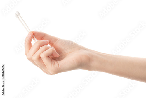 Hand holding cotton swabs isolated on white background. Disposable personal hygiene products. Healthy lifestyle. Hygiene. Health.