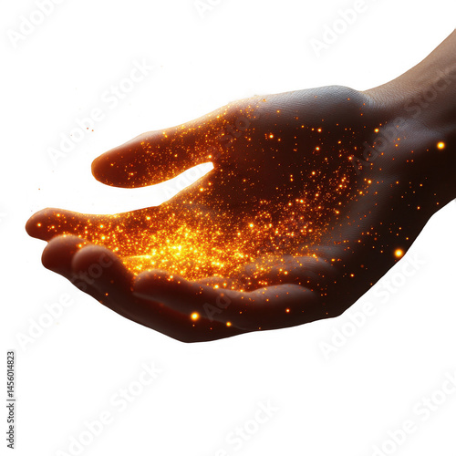 Hand holding glowing particles magic sparkle dust fantasy light effect on transparent background