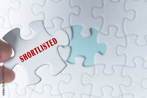 Hand holding piece of jigsaw puzzle with word Shortlisted.