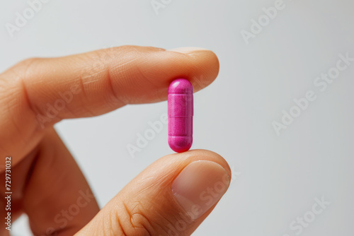 Hand holding pink pill, healthcare: medicine, antibiotic, supplement