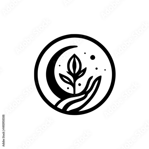 Hand Holding Plant with Moon, Minimalist Emblem