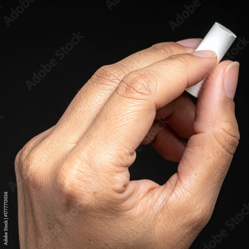 Hand Holding White Chalk Against Black Background