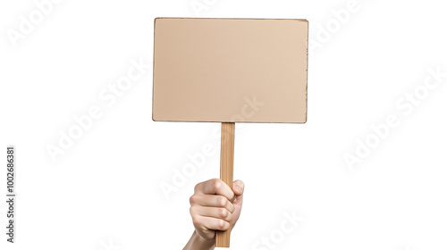 Hand holding wooden stick or blank protest sign isolated on transparent or white background