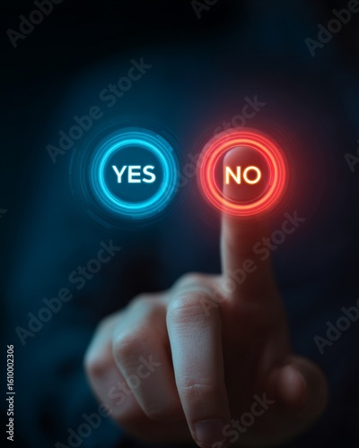 Hand hovering over glowing yes and no buttons representing a decision point.