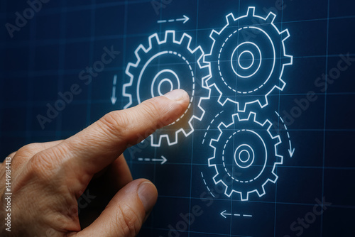 Hand interacts with digital interface displaying mechanical gear icons symbolizing consulting and technical process optimization in modern setting