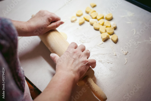 hand modeling dumplings at home in the kitchen. pelmeni lay on a baking sheet