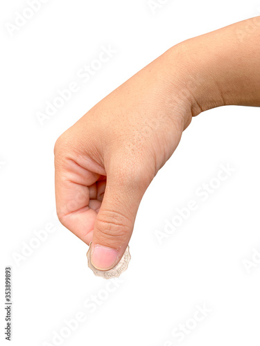 hand of a person holding a money coin with copy space. Isolated on white background with clipping path.