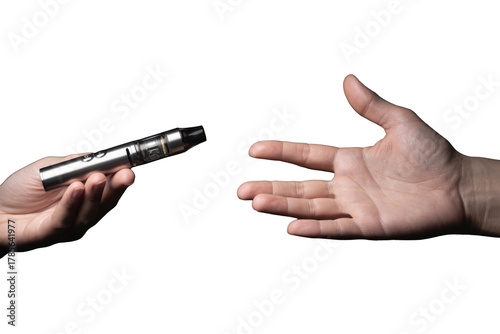 hand offering vape pen on white background.