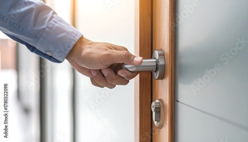 Hand on doorknob opens a wood-framed glass door, casting light & shadow, evoking a sense of entry or privacy