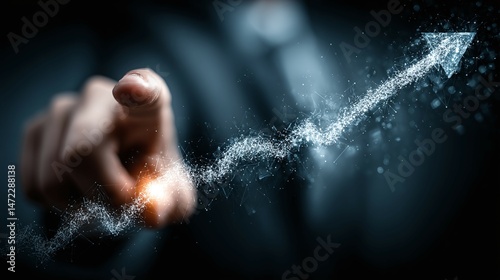 Hand points to upward arrow representing growth success and positive trend.