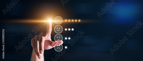 hand pressing smartphone with smiley face icon and five star on visual screen for positive feedback.
