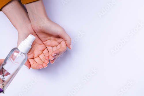 Hand protection against bacteria. Female hands and antiseptic spray on a white background.