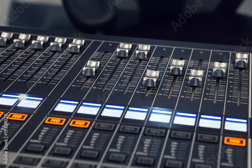 hand push volume up. ,mixer music in studio., professional sound engineer.