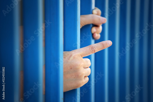 Hand Reaching Through Blue Bars Symbolizing Confinement and Hope