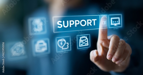 Hand touching a virtual screen with support service icons on a blue background, text SUPPORT, technology, and business concept.