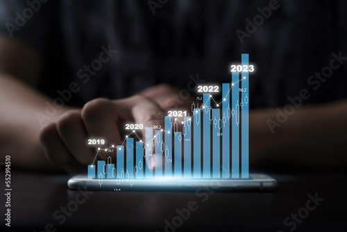Hand touching smartphone with virtual increasing technical graph for trader analysis business stock market chart concept.