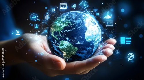 Hand with Earth Surrounded by Technology Icons: A hand holding the Earth, surrounded by floating technology icons, symbolizing the digital world's impact on the planet.
