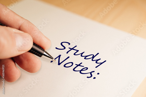 Hand writing study notes on a notebook using a pen, preparing for an exam