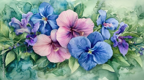 Handcrafted watercolor bouquet featuring blue violets pink hibiscus and orchids among green foliage on a green backdrop Ideal for Mother s Day invitations and greeting cards