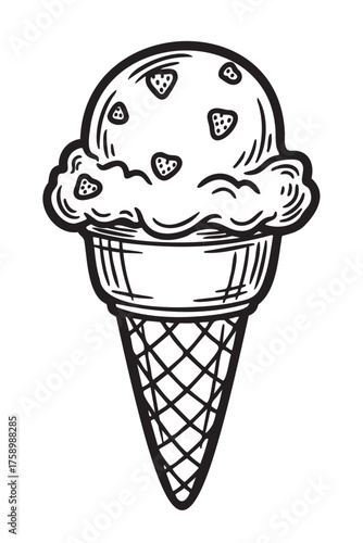 Hand-drawn black and white illustration of a single ice cream cone featuring a scoop with small heart toppings and a waffle cone base.