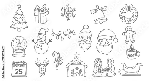 Hand-Drawn Christmas Icon Set – Tree, Santa, Gifts, Wreath, Reindeer, Snowman, Holiday Doodles