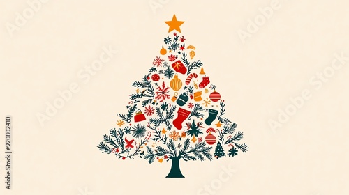 Hand-drawn Christmas tree with ornaments and festive decorations.