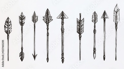 Hand-drawn collection of various arrow designs showcasing intricate details and unique shapes ideal for artistic and educational purposes in historical contexts.
