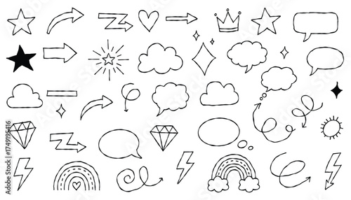 Hand-drawn doodle set with speech bubbles, arrows, stars, clouds, crowns, rainbows and shapes.