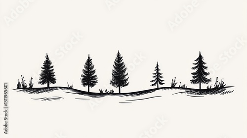 Hand-drawn forest scene, nature silhouette, simple landscape, background design, illustration