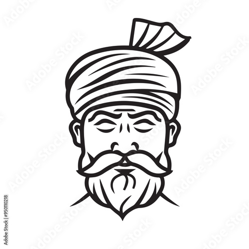 Hand-Drawn Indian Farmer Portrait Vector Illustration in Black and White Engraved Woodcut Style