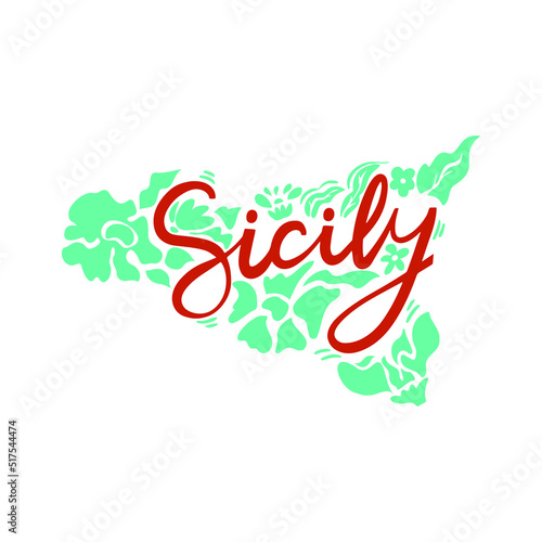 Handdrawn map of Sicily with colourful flowers. Italian Sicily text. Visit Italy concept. Poster design or postcard illustration. Business travel card.