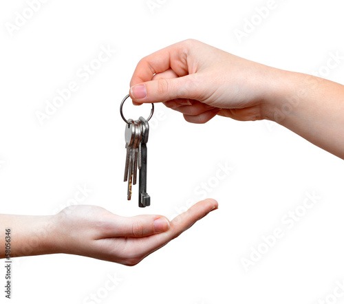 Hands and key isolated on white background